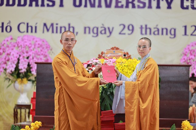 Sau đó, chư vị Phó Viện trưởng đã luân phiên đại lao Đại lão Hòa thượng Viện trưởng trao văn bằng đến các học viên Thạc sĩ, Cử nhân chính quy và hệ đào tào từ xa; học viên Cao đẳng tốt nghiệp trong đợt này.