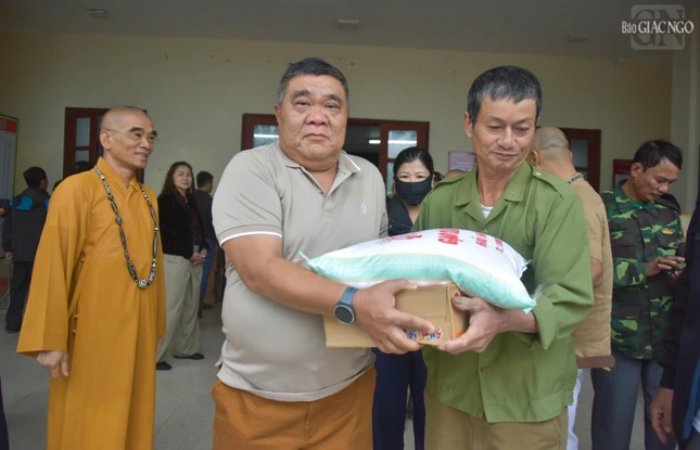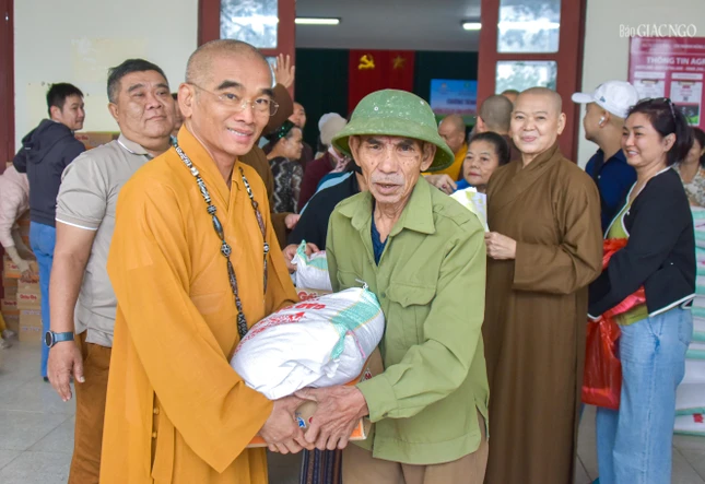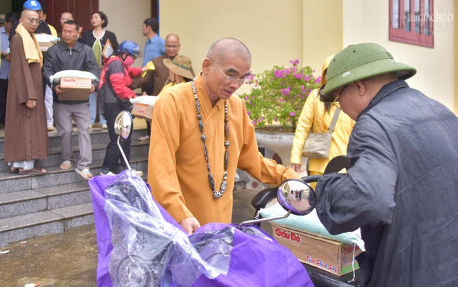 Thượng tọa Thích Tuệ Hải hỗ trợ người dân nhận quà |