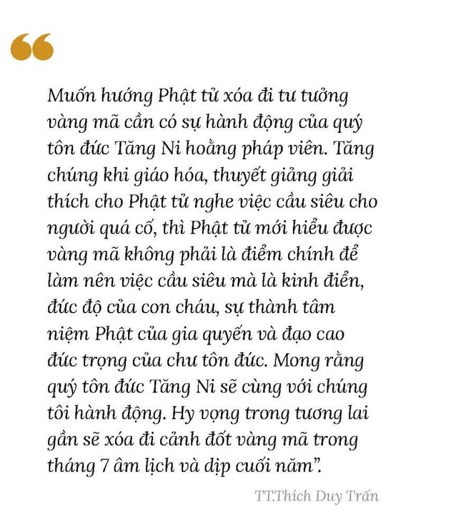 Chia sẻ với báo Giác Ngộ, Thượng tọa Thích Duy Trấn, Phó ban Đại diện Phật giáo người Hoa, Phó Thường trực Ban Trị sự GHPGVN quận 11, trụ trì chùa Liên Hoa cho biết lý do thầy “táo bạo” tuyên bố nói không với vàng mã: