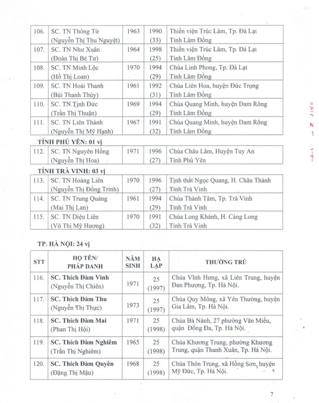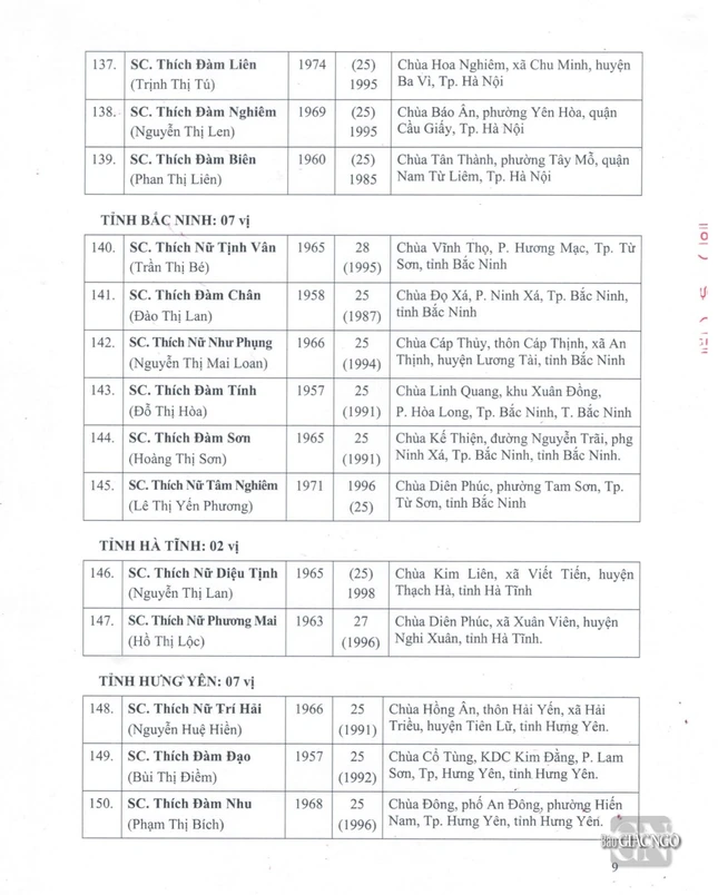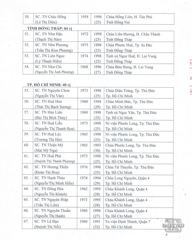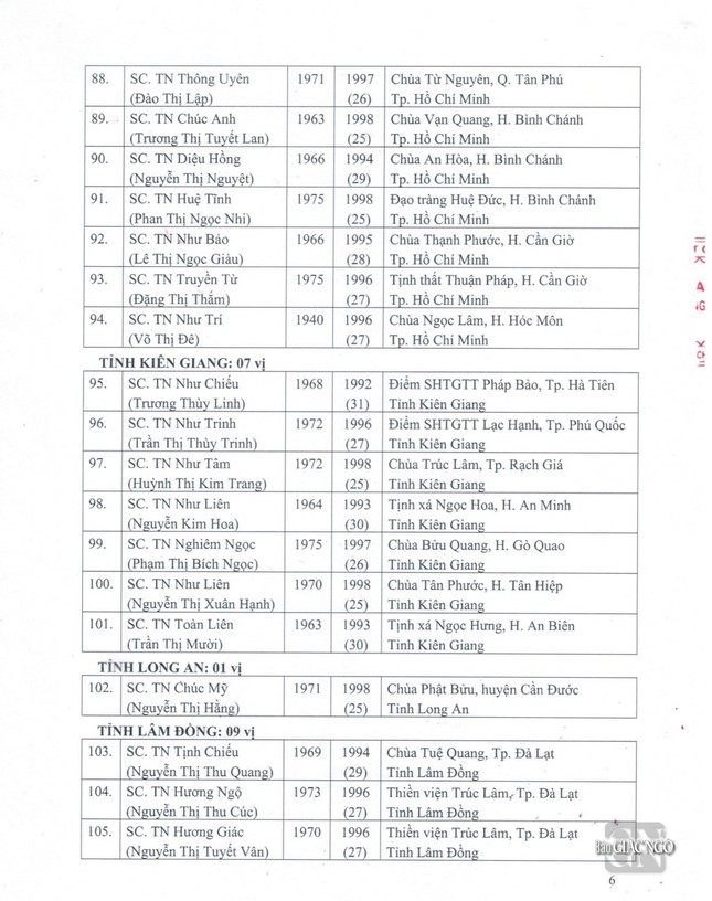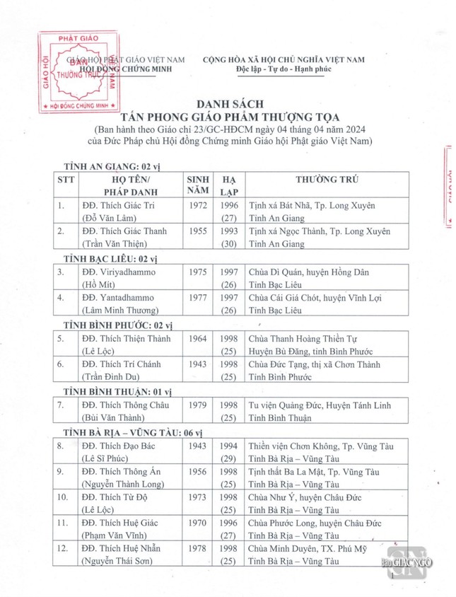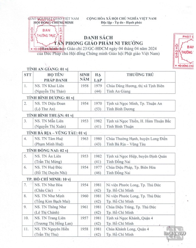 GNO - Thông tin từ Văn phòng Đức Pháp chủ GHPGVN, căn cứ Nghị quyết Hội nghị kỳ III của Ban Thường trực Hội đồng Chứng minh nhiệm kỳ 2022-2027, Đức Pháp chủ đã ban hành Giáo chỉ số 23/GC-HĐCM, ngày 4-4-2024, tấn phong Giáo phẩm cho 317 vị Tăng Ni.
