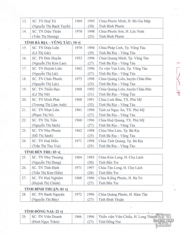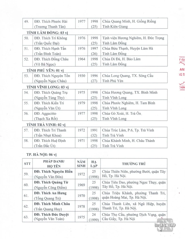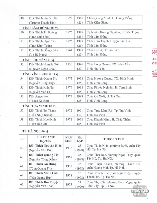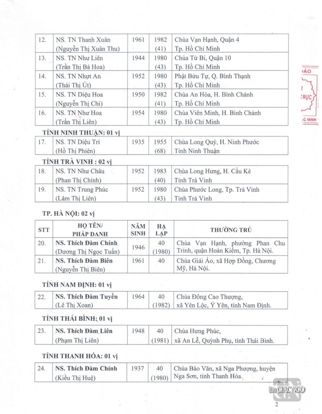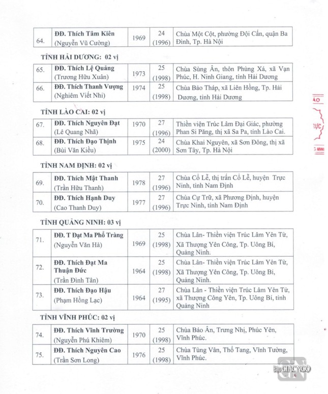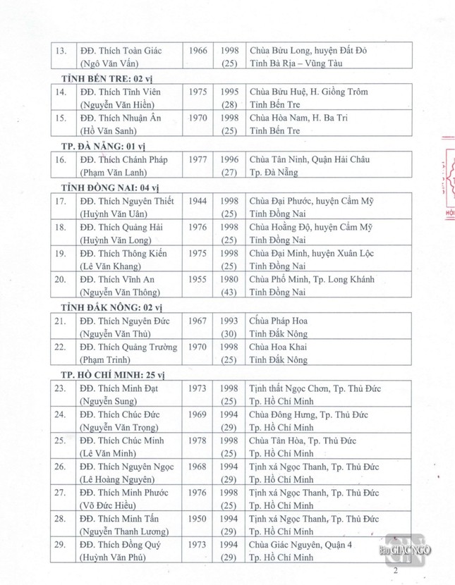 Sau đây là danh sách được Đức Pháp chủ GHPGVN ban Giáo chỉ tấn phong chính thức: