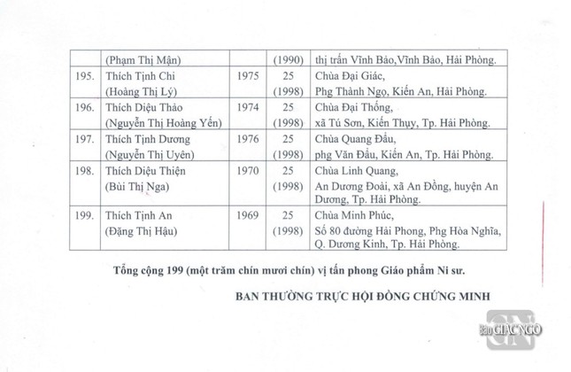 Cụ thể: Tấn phong 17 vị Thượng tọa lên giáo phẩm Hòa thượng; 76 Đại đức lên giáo phẩm Thượng tọa; 25 Ni sư lên giáo phẩm Ni trưởng; 199 Sư cô lên giáo phẩm Ni sư.