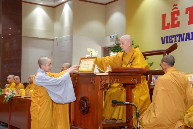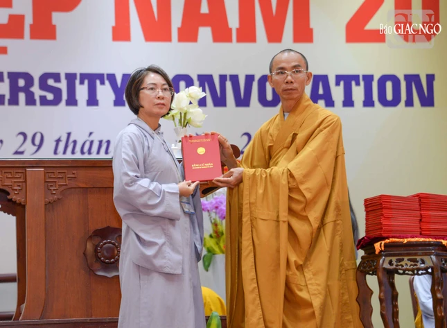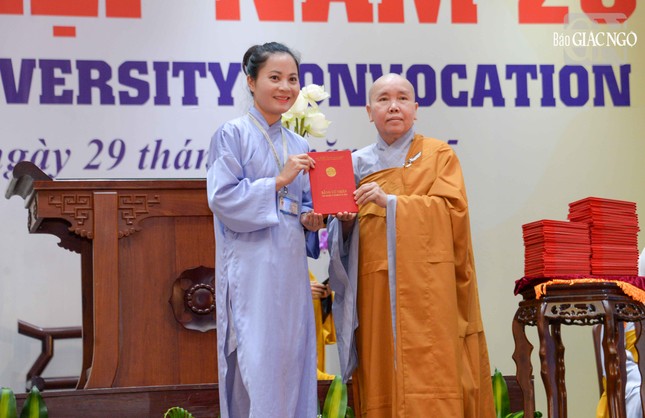Tại buổi lễ, Đại lão Hòa thượng Viện trưởng đã trao Bằng tốt nghiệp đến thủ khoa thạc sĩ Phật học khóa VI, thủ khoa cử nhân 7 khoa, thủ khoa lớp Cao đẳng liên thông Tiền Giang và Đồng Nai.