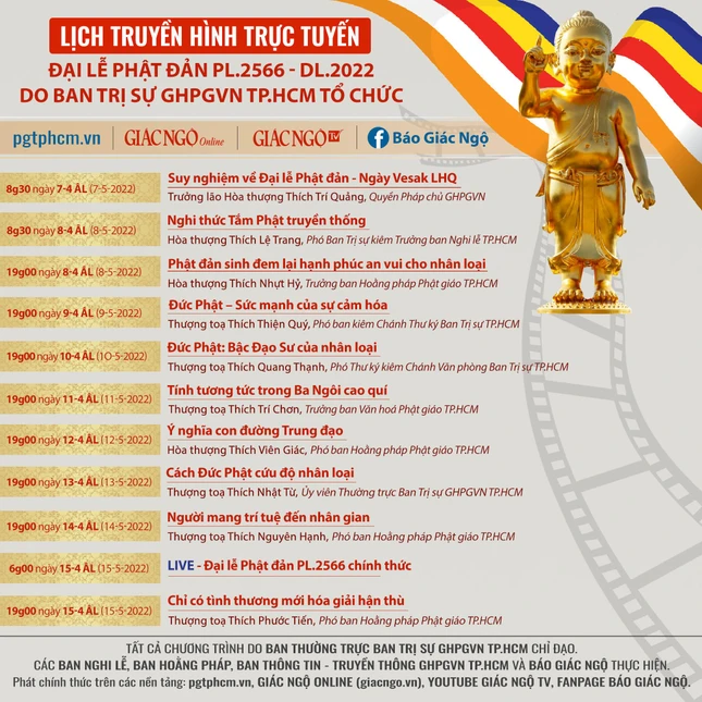 Ban Thông tin - Truyền thông GHPGVN TP.HCM, đơn vị được Ban Tổ chức giao phụ trách cho biết Đại lễ sẽ được truyền hình trực tiếp qua Giác Ngộ Online, các nền tảng số của Báo Giác Ngộ, Cổng thông tin điện tử của Phật giáo TP.HCM (pgtphcm.vn)…