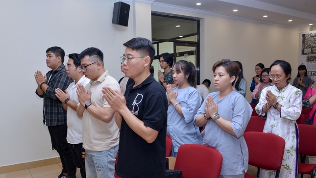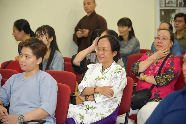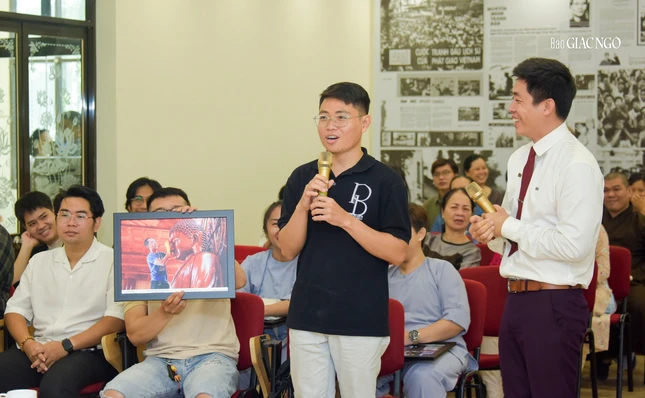 Hội trường xúc động khi Phật tử Hoa Minh chia sẻ về niềm hạnh phúc giản đơn của đội ngũ cộng tác viên - Phật tử đạo tràng Pháp Hoa, mỗi tuần chỉ trông chờ đến ngày thứ Năm để lên tòa soạn gói báo, gửi cho độc giả các tỉnh thành. "Thời gian làm việc từ 5 giờ 30 tới 8 giờ sáng nhưng đó là khoảng thời gian quý giá, nhiều ý nghĩa với anh, chị em chúng con", Phật tử Hoa Minh bộc bạch.