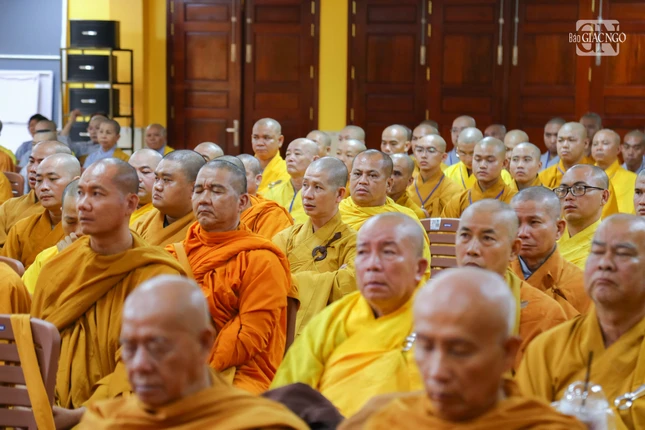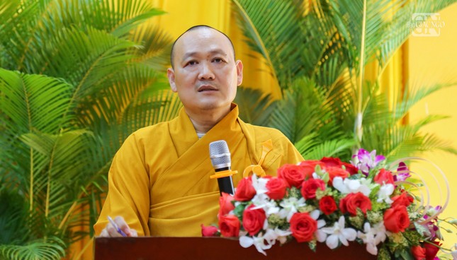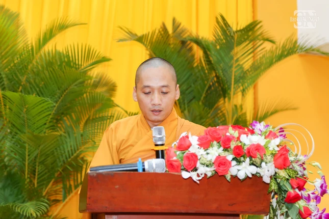 Tại buổi lễ, Thượng tọa Thích Viên Quang, Phó ban kiêm Chánh Thư ký Ban Trị sự GHPGVN tỉnh An Giang thay mặt Ban Kiến đàn báo cáo công tác tổ chức trong những ngày qua.