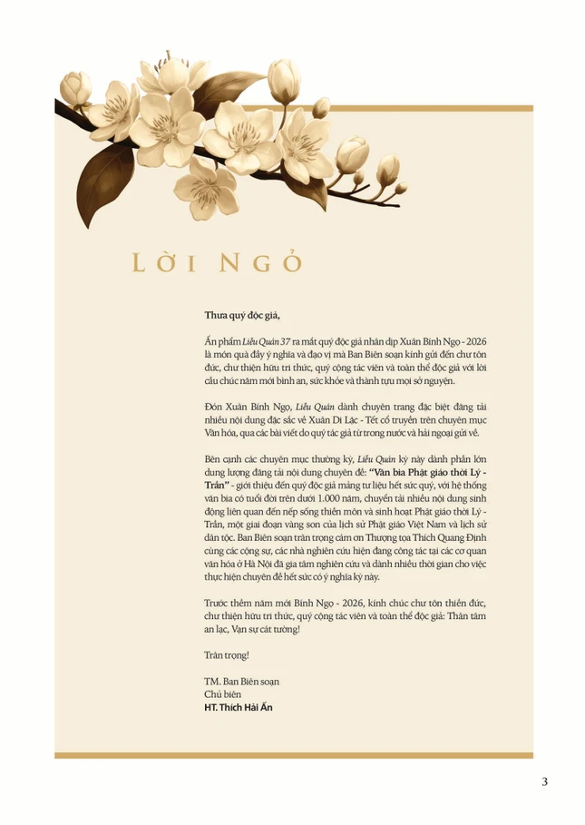 Đó là lời ngỏ của Hòa thượng Thích Hải Ấn thay mặt Ban Biên soạn chia sẻ trong trang đầu của ấn phẩm Liễu Quán số 37, góp thêm một giai phẩm văn hóa và Phật giáo ý nghĩa trong mùa Xuân Bính Ngọ 2026 này.