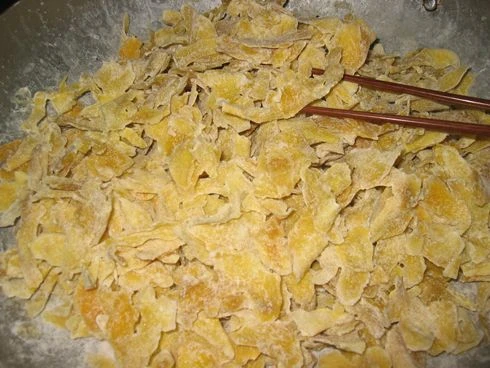 Thế rồi như được phép mầu Tấm Cám, Phạm Công Cúc Hoa, mạ và chị đã đẩy lửa, đẩy tay tôi riu riu rim mứt. Chảo mứt gừng của tôi đến hồi cũng ráo đường. Tuy không đẹp bằng mứt gừng mẹ và chị làm, lát gừng cong cong không thẳng thớm, nhưng tinh khiết, không bị chất tẩy hóa học, ăn vào thật đúng là gừng Huế, vừa cay vừa thơm mùi gừng làm ấm thêm chén trà đầu năm.