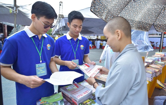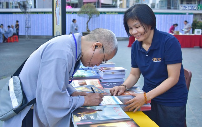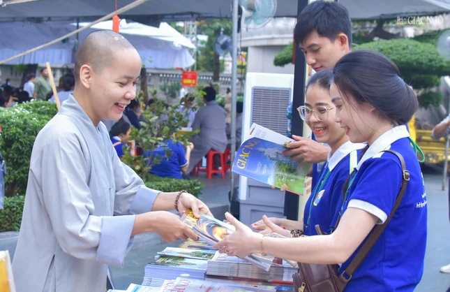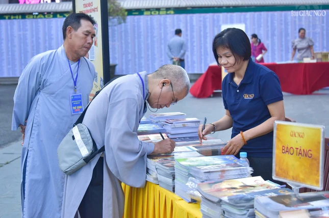 | Bạn đọc, thí sinh Hội thi giáo lý Phật tử 2024 đến điểm tặng Báo Giác Ngộ tại Việt Nam Quốc Tự |