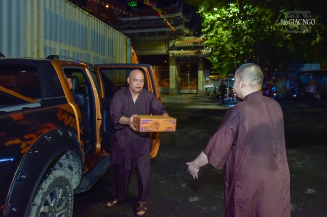 | Các thành viên của Ban Kinh tế - Tài chính T.Ư, Ban Từ thiện xã hội GHPGVN TP.HCM cũng như chư Tăng chùa Vĩnh Nghiêm sắp xếp các thùng mì lên xe |