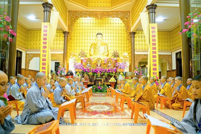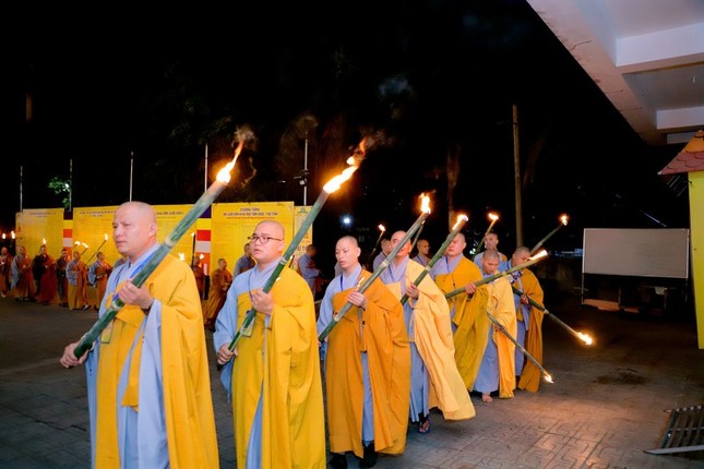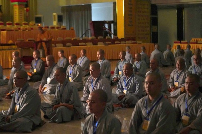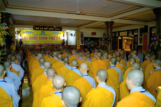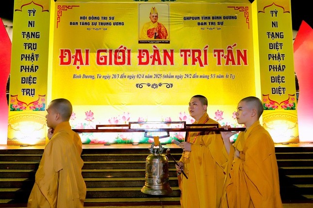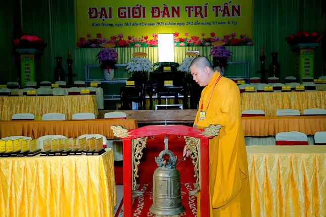 Trước đó, Đại đức Thích Huệ Nghiêm, Phó Thư ký kiêm Phó Văn phòng Ban Trị sự Phật giáo tỉnh Bình Dương, Thư ký Ban Kiến đàn cùng chư tôn đức đã hô canh và đại chúng lắng đọng thân tâm, tĩnh tọa.