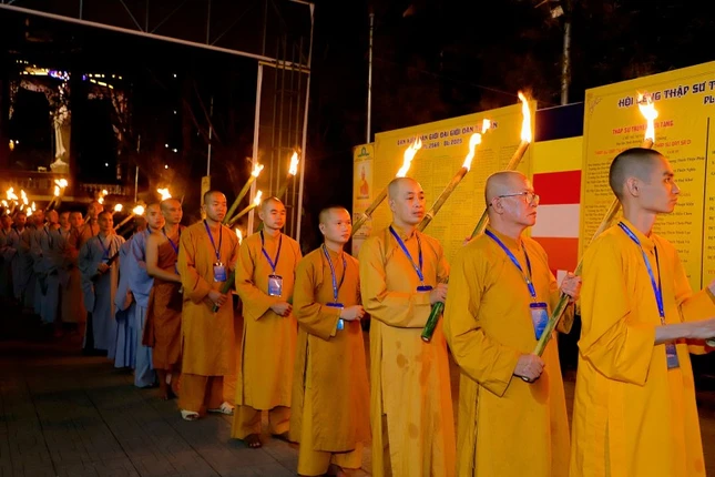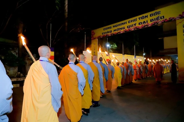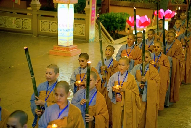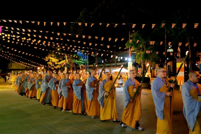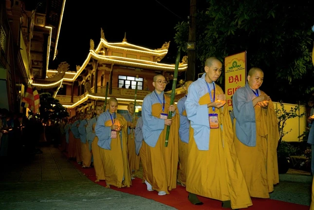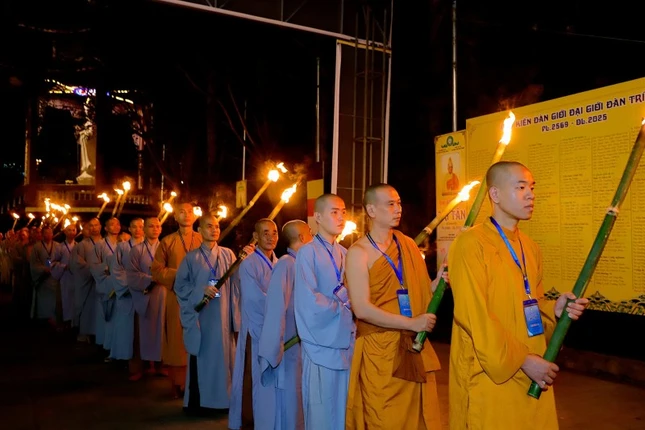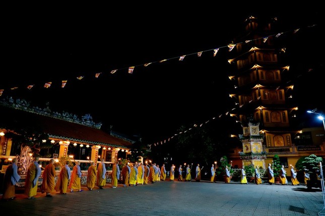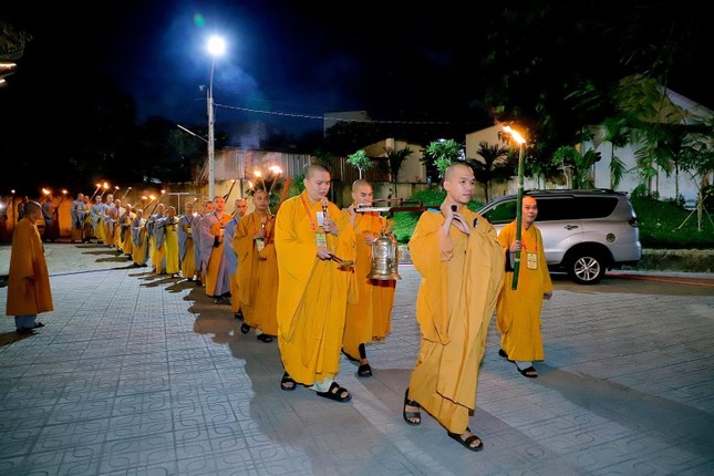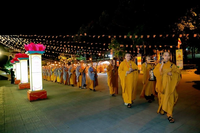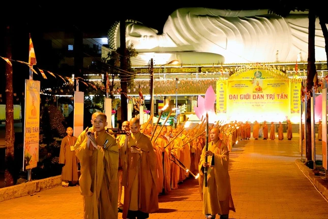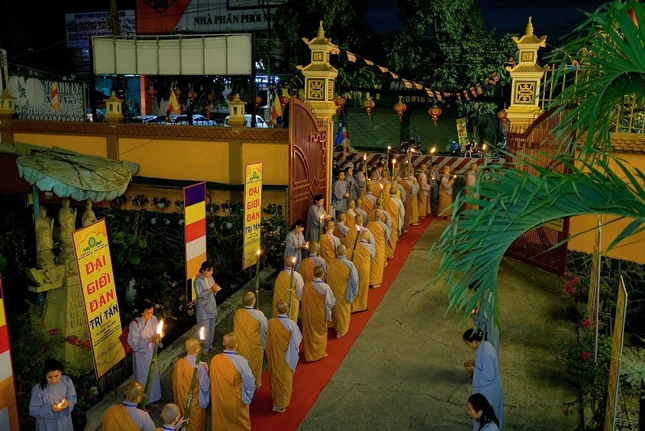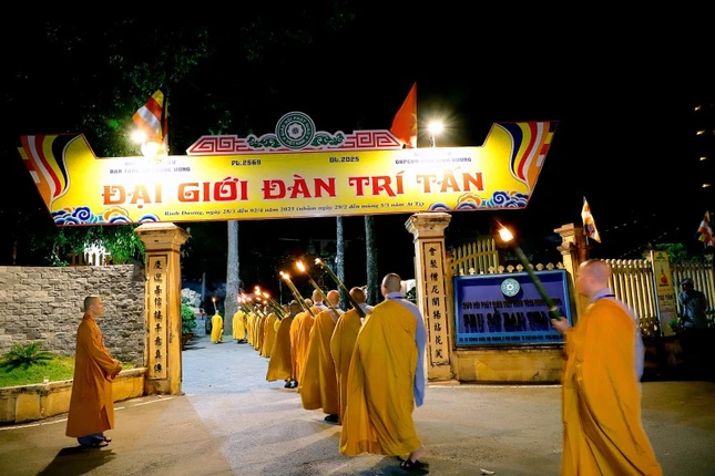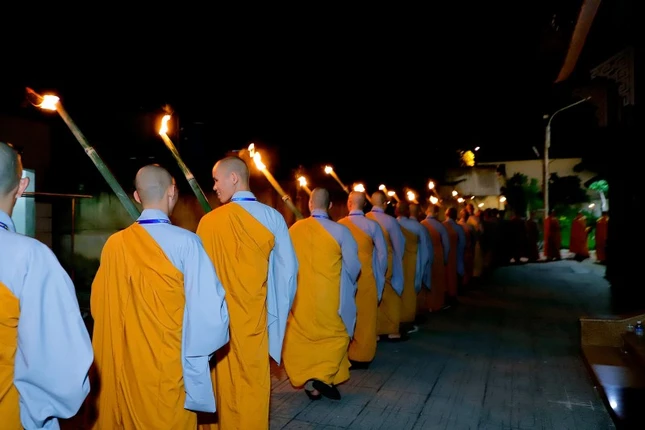 GNO - Tối 29-3, chư tôn đức Ban Quản giới tử Đại giới đàn Trí Tấn hướng dẫn các giới tử Tỳ-kheo và Sa-di trang nghiêm tọa thiền và thực hiện nghi thức tuần chiếu trong khuôn viên tổ đình Hội Khánh (P.Phú Cường, TP.Thủ Dầu Một).