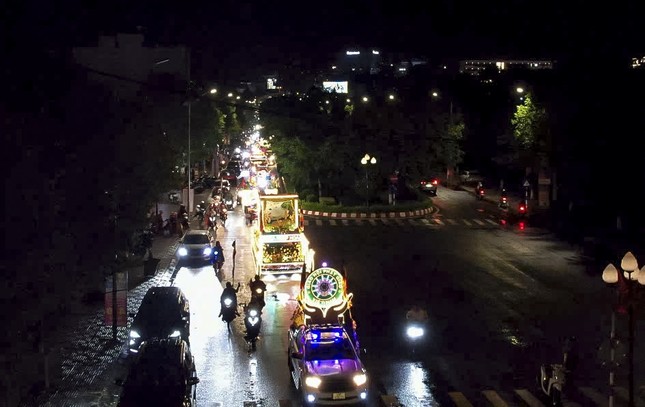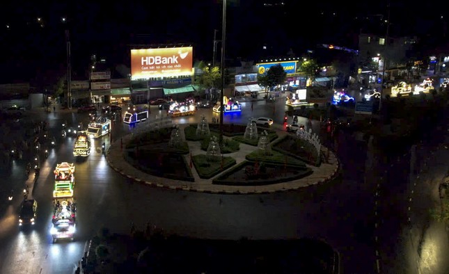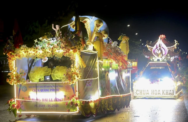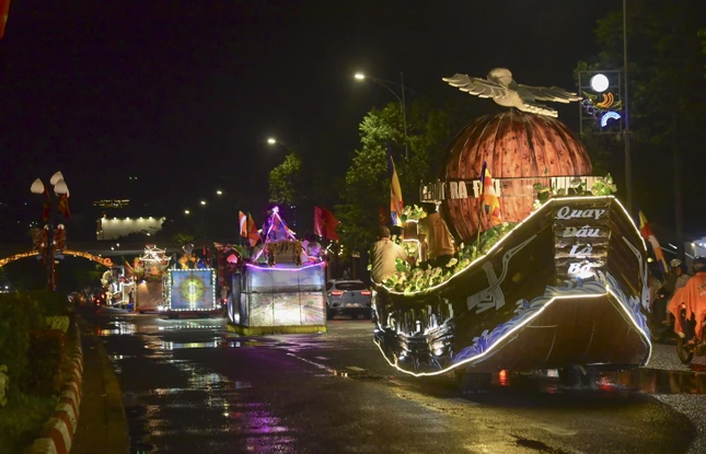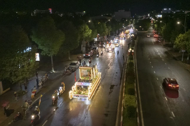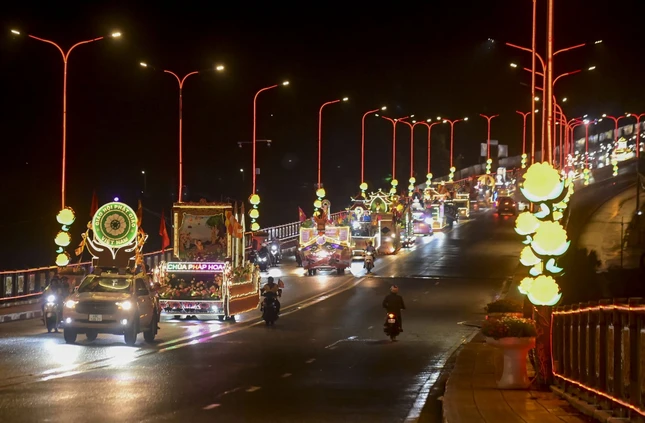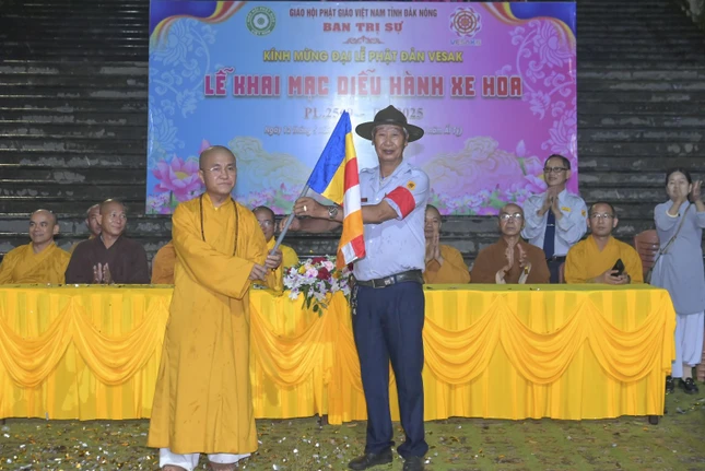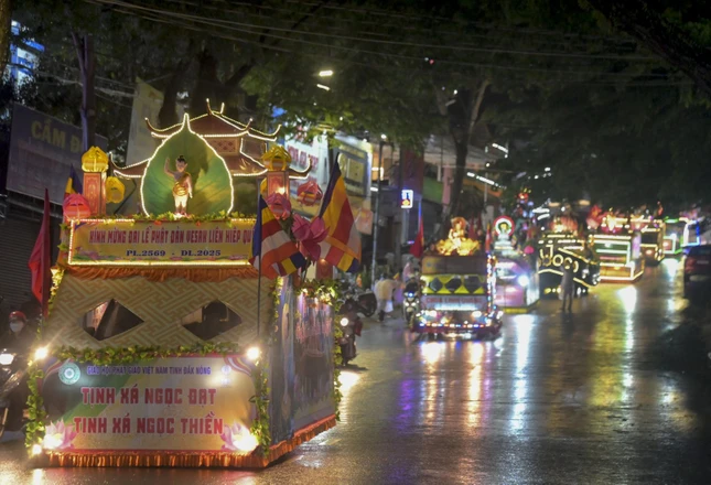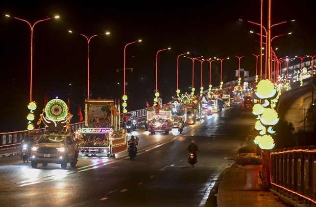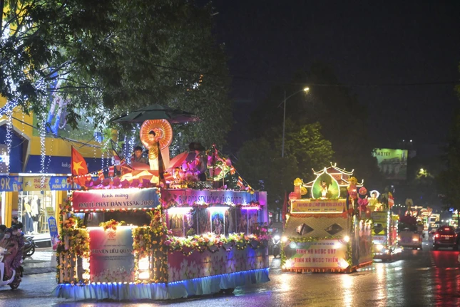 Đoàn xe hoa khởi hành tại chùa Pháp Hoa và diễu hành trên các trục lộ chính của TP.Gia Nghĩa. Những chiếc xe hoa nối đuôi nhau thành đoàn dài thu hút đông đảo bà con Phật tử và người dân hưởng ứng theo dõi.