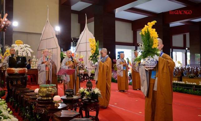 Ni trưởng Thích nữ Tắc Sen, Trưởng Tiểu ban Nghi lễ Đại lễ tưởng niệm đã chủ trì thực hiện nghi thức dâng lục phẩm cúng dường, tưởng niệm.