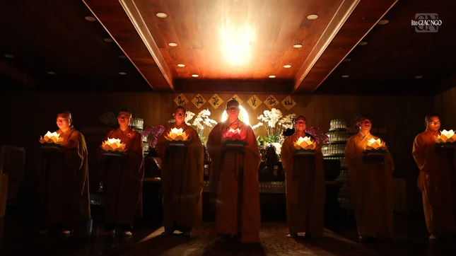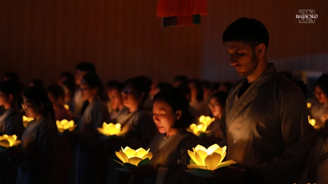 Trong giây phút thiêng liêng, gần 600 ngọn đèn hoa đăng bừng sáng - ánh sáng tượng trưng cho niềm tin, trí tuệ và tâm từ bi. Giữa không gian lắng đọng, mọi người nhất tâm cầu nguyện đất nước thái bình, nhân dân an lạc, gia đạo an vui, tự thân tinh tấn tu tập, sống đời hướng thiện và lan tỏa yêu thương đến muôn loài.