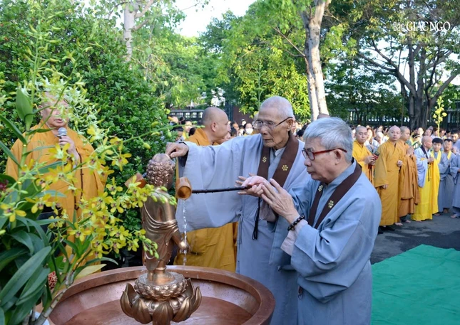Sau đó, chư Tăng cùng Phật tử tuần tự thực hiện nghi thức Tắm Phật trong không khí trang nghiêm, thành kính nhân kỷ niệm ngày Đức Phật đản sanh Phật lịch 2569.