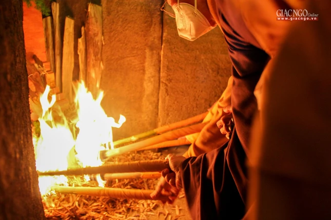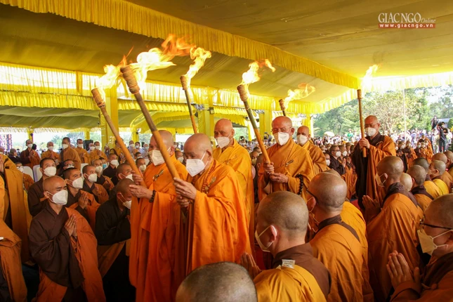 Sau khi kim quan an vị tại đài trà-tỳ, chư tôn đức gồm: Hòa thượng Thích Giác Quang, Hòa thượng Thích Đức Thanh, Hòa thượng Thích Chí Thắng, Hòa thượng Thích Chí Viên cùng đại diện pháp tử: Thượng tọa Thích Từ Đạo và Thầy Thích Chân Pháp Ấn đã rước lửa tam muội từ Phật đài châm lửa trà-tỳ thân tứ đại của Thiền sư Thích Nhất Hạnh.