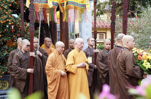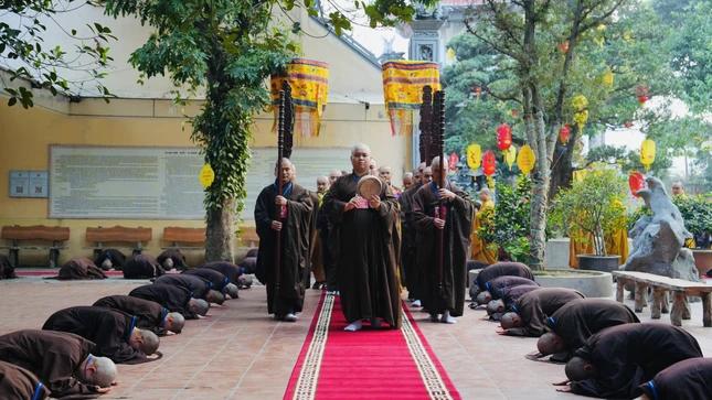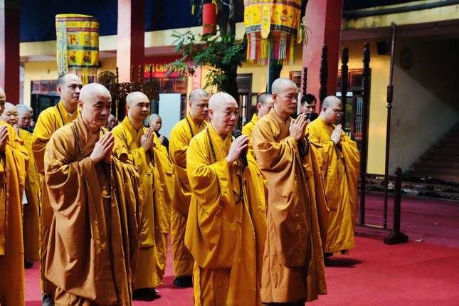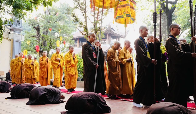 Sau khi cung nghinh Đức Pháp chủ an tọa nơi lễ đường, Hòa thượng Thích Bảo Nghiêm, Phó Chủ tịch Hội đồng Trị sự, Trưởng ban Trị sự GHPGVN TP.Hà Nội, Trưởng ban Kiến đàn cùng chư tôn đức Ban Kiến đàn, Ban Trị sự, giới sư Tăng Ni và đại diện các nghiệp sư đã vân tập bái chào theo nghi thức truyền thống thiền môn miền Bắc.