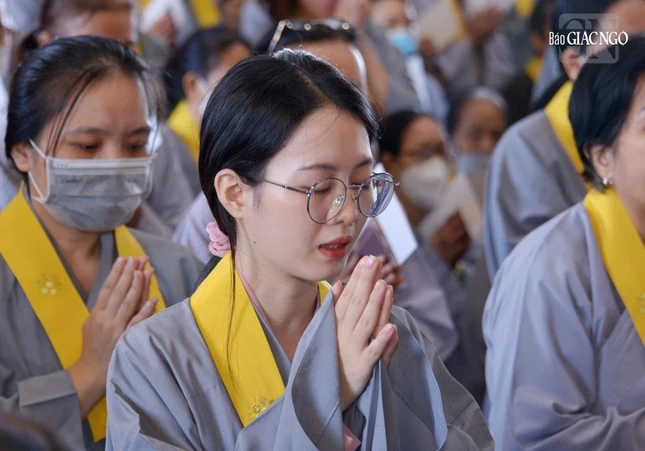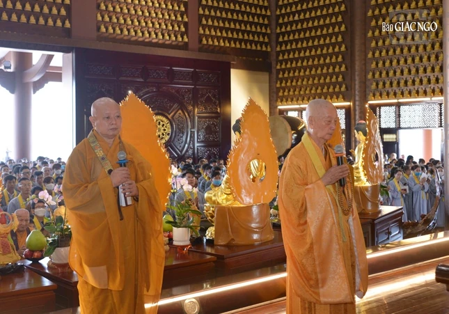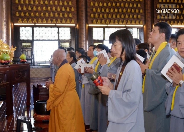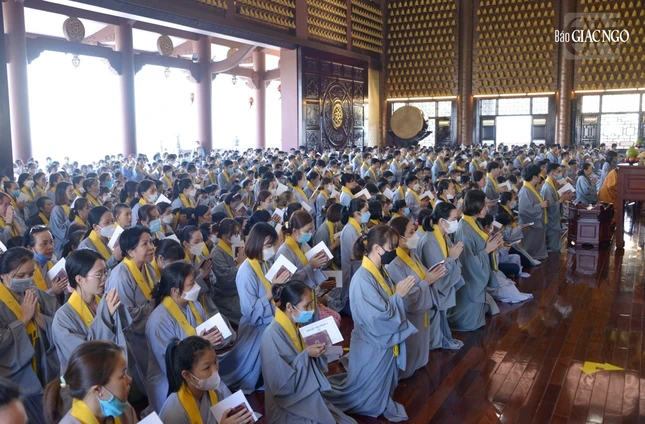 | Hàng ngàn người tham dự, trong đó có gần 1.000 người phát tâm quy y Tam bảo tại chùa Huê Nghiêm sáng 5-3-2023 |