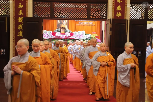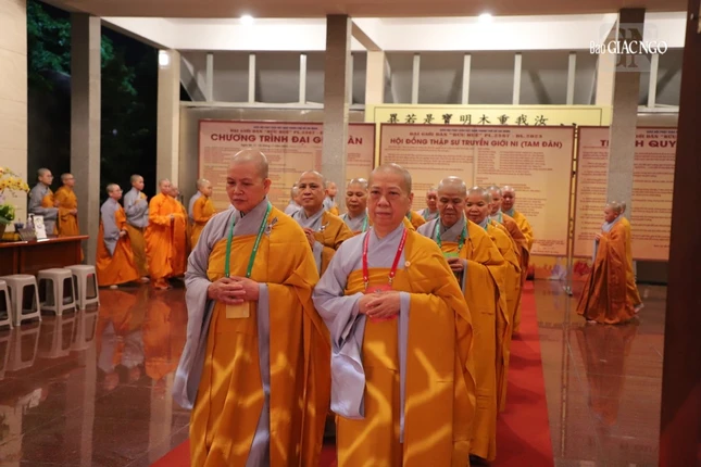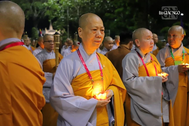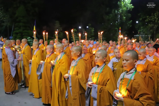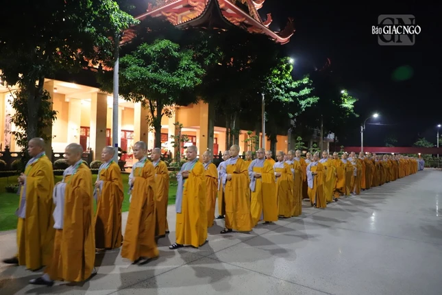 GNO - Tối 18-11 (6-10-Quý Mão), ngày thứ hai của Đại giới đàn Bửu Huệ Phật lịch 2567, Ban Điều hành, Ban Quản giới tử giới trường Ni - chùa Thanh Tâm đã hướng dẫn giới tử thực hiện nghi thức hô canh, tuần chiếu trong khuôn viên đại giới.