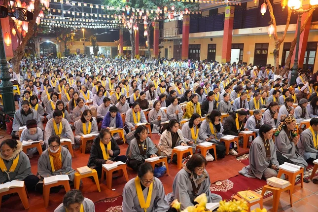 Sau đó, dưới sự chủ lễ của chư tôn đức, đại chúng trang nghiêm đối trước Phật đài, trì tụng kinh Pháp hoa thông tiêu theo nghi thức truyền thống.