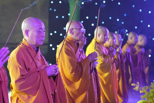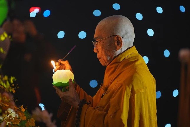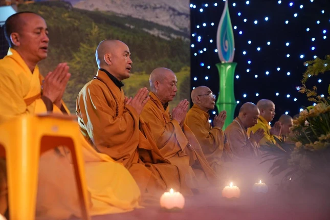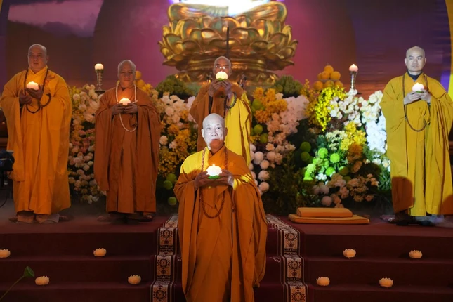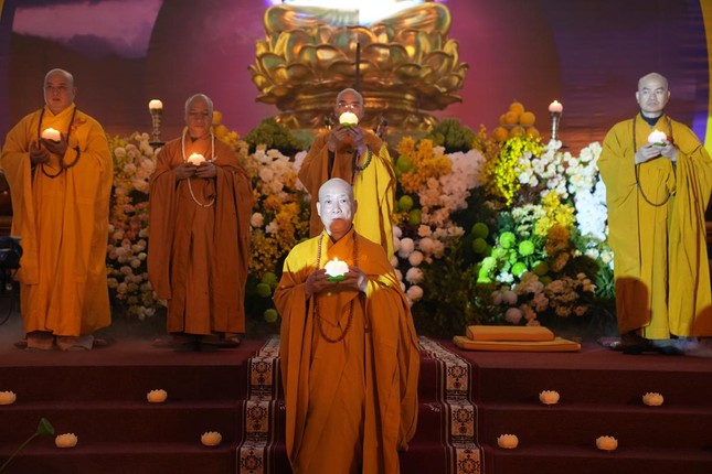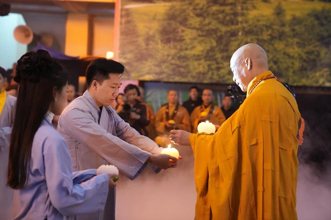 Trong giây phút thiêng liêng, Trưởng lão Hòa thượng Thích Quang Nhuận tiếp nhận ánh sáng từ bàn thờ Phật và trang nghiêm truyền trao đến chư tôn đức chứng minh. Hòa thượng Thích Bảo Nghiêm mang theo ánh sáng giác ngộ truyền đến đại chúng.
