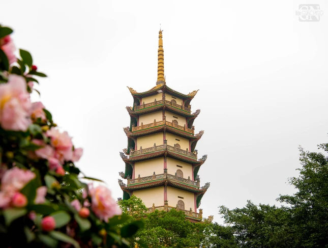 Phía trước chùa, hồ nước trong xanh nằm yên như tấm gương lớn. Giữa hồ, lầu gác mô phỏng chùa Một Cột vươn lên, dáng sen thanh thoát. Buổi chiều, khi mặt trời nghiêng bóng, sắc trời hòa vào mặt nước, tiếng lá rơi khẽ chạm vào sóng, tất cả tạo nên một bức tranh vừa tĩnh vừa động, vừa thực vừa mơ.