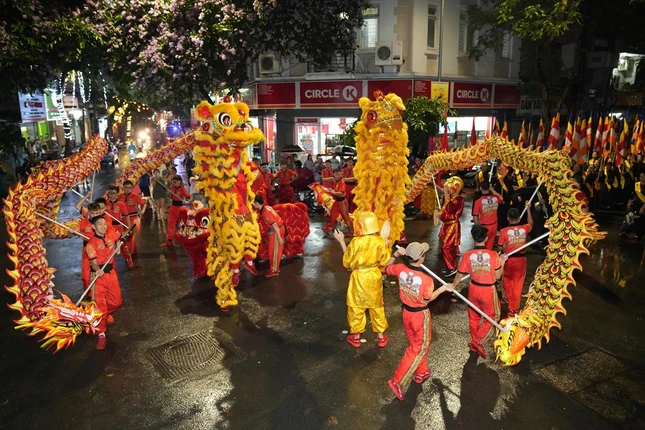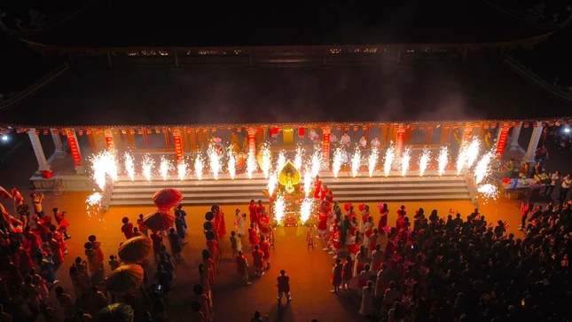 | Lễ rước Phật đã được mở đầu bằng màn trình diễn pháp hoa rực rỡ sắc màu |