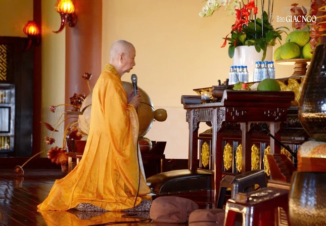 Đại lão Hòa thượng phương trượng chùa quang lâm niêm hương bạch Phật, trực tiếp hướng dẫn nghi thức sám hối và phát nguyện cho người mới phát tâm.
