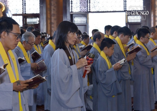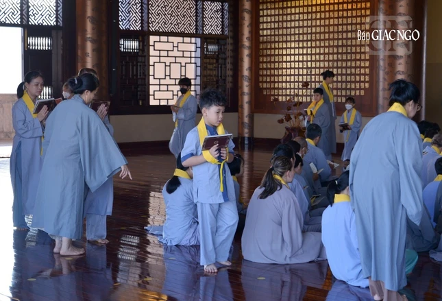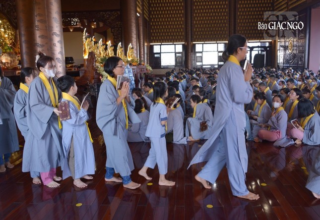 Sau khi được hướng dẫn về oai nghi căn bản của người Phật tử, tại chánh điện chùa Huê Nghiêm, Đại lão Hoà thượng Thích Trí Quảng, viện chủ chùa Huê Nghiêm quang lâm niêm hương bạch Phật, hướng dẫn người phát tâm sám hối và phát nguyện quy y ba ngôi báu là Phật, Pháp và Tăng bảo.