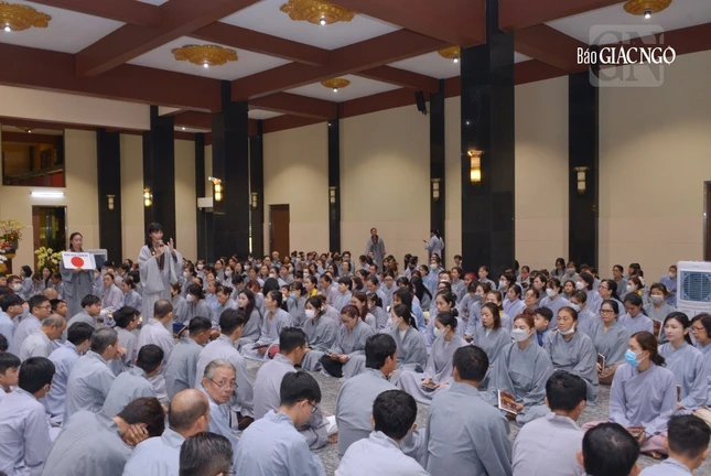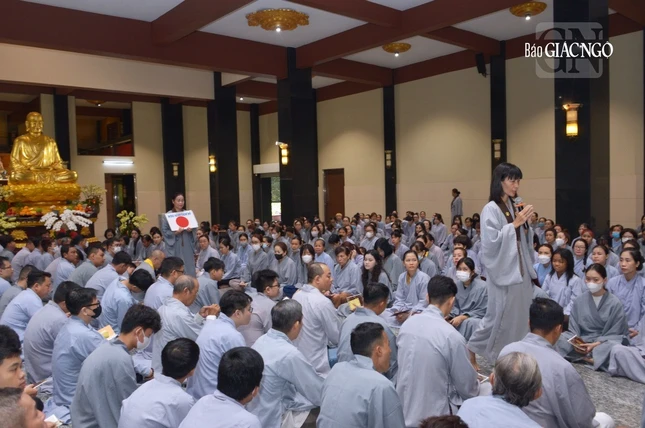 Dịp này, Hòa thượng Thích Lệ Trang, trụ trì chùa Huê Nghiêm đã có thời pháp thoại, nói về vai trò của Tam bảo trong đời sống tâm linh và ý nghĩa thiết thực của 5 giới căn bản trong đời sống đạo đức đưa đến sự hạnh phúc cho người Phật tử tại gia.