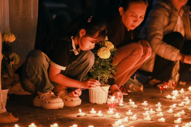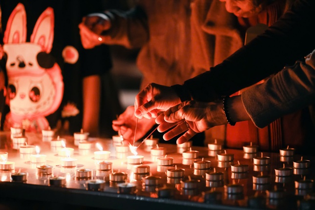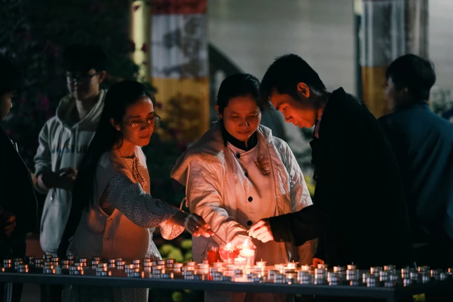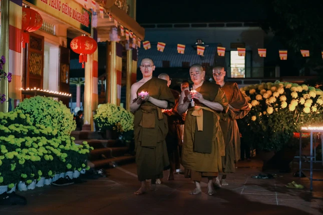 Nghi thức dâng đăng cúng dường ánh sáng diễn ra trong bầu không khí trang nghiêm, khi hàng trăm ngọn nến được thắp lên, biểu trưng cho trí tuệ và lòng tôn kính dâng lên Tam bảo. Sau đó, chư Tăng và Phật tử cùng nhau nhiễu quanh điện Phật, thành kính trì niệm, hòa quyện giữa ánh sáng lung linh và tiếng kệ ngân vang, tạo nên một khung cảnh huyền diệu và thiêng liêng.