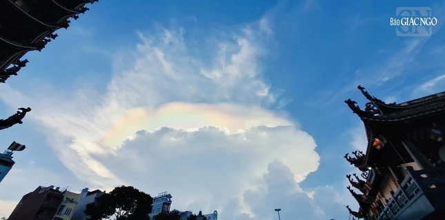 GNO - Khoảng 15 giờ 30 đến 16 giờ 20 chiều 12-5, trên bầu trời TP.HCM xuất hiện những áng mây ngũ sắc tuyệt đẹp với các gam màu xanh, đỏ, vàng, hồng, tía xen lẫn vào nhau. Áng mây ngũ sắc xuất hiện phía sau tôn tượng Bồ-tát Quán Thế Âm tại Việt Nam Quốc Tự (Q.10) càng thêm phần lung linh, huyền diệu...