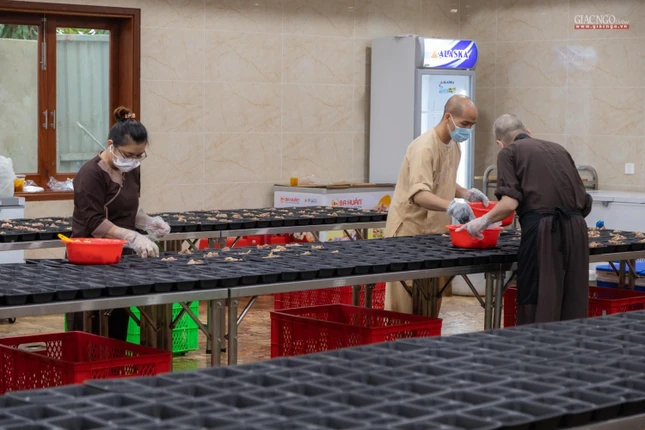 Hàng ngày, các công việc chính tại bếp ăn thiện nguyện chùa Vĩnh Nghiêm được thực hiện bởi chư Tăng gồm 90 vị và gần 150 Phật tử, tình nguyện viên. Phật tử, tình nguyện viên tham gia phục vụ bếp ăn được bố trí nơi ăn ngủ tại chỗ và được kiểm tra sức khỏe, test nhanh định kỳ. Nhân sự được phân công cụ thể theo từng khâu cắt gọt, nấu nướng, đóng hộp,… nhằm đảm bảo bếp ăn được hoạt động liên tục.