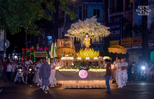 Xe hoa chủ đề "Ấn cát tường" của Báo Giác Ngộ tham gia diễu hành kính mừng Phật đản PL.2567 tại TP.HCM