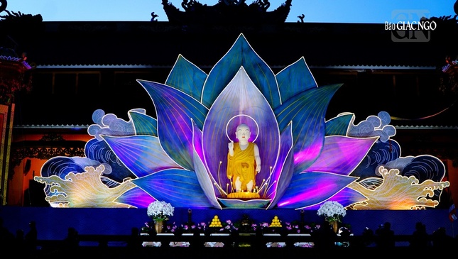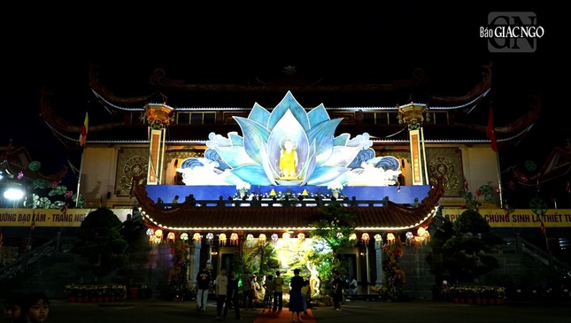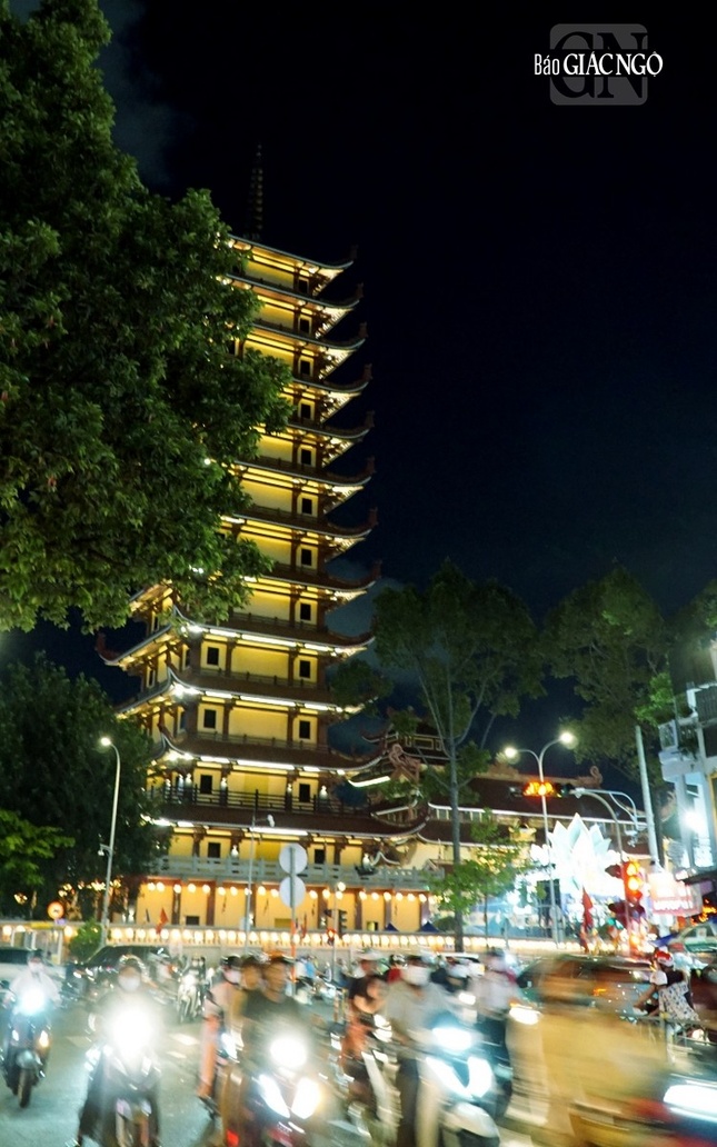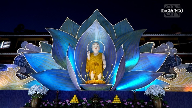 GNO - Sắc màu lung linh hiện lên trên nền trời đêm ở Việt Nam Quốc Tự - nơi lễ đài chính của Phật giáo TP.HCM trang nghiêm tôn trí Đức Phật sơ sinh ấn tượng bên trong hình tượng một đóa sen "khổng lồ" trở nên mầu nhiệm với sự biến chuyển nhiều sắc thái khác nhau tạo nên nét độc đáo riêng.