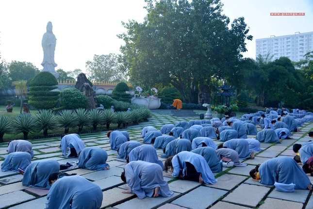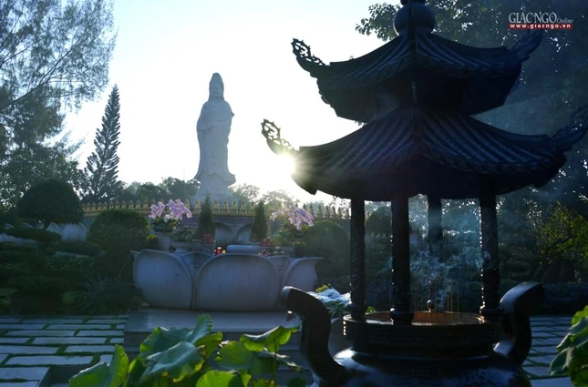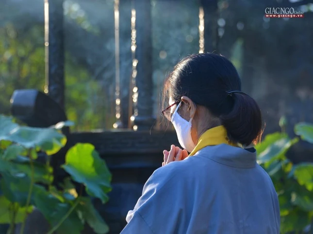 Thời tiết sáng rằm tháng Bảy tại TP.HCM nắng đẹp. Ngay từ rất sớm, vào khoảng 5 giờ sáng, nhiều Phật tử đã đến chùa Huê Nghiêm - TP.Thủ Đức tham dự thời tụng kinh sớm tại tượng đài Bồ-tát Quán Thế Âm.