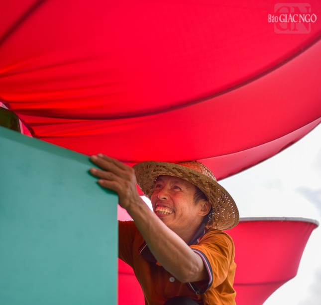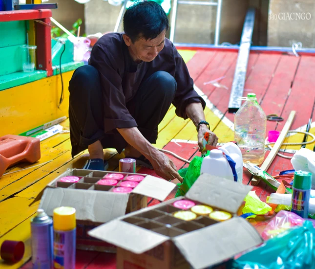 Những ngày đầu tháng 4 Âm lịch, khắp mọi con đường bên dòng kênh Nhiêu Lộc tràn ngập cờ hoa đón mừng Phật đản. Giữa không gian đầy sắc màu ấy thấp thoáng những bóng áo nâu, lưng ướt đẫm mồ hôi đang cặm cụi tô tô vẽ vẽ, trang trí cho chiếc thuyền hoa đang neo đậu trước tổ đình Vạn Thọ (Q.1, TP.HCM) thêm phần rực rỡ.