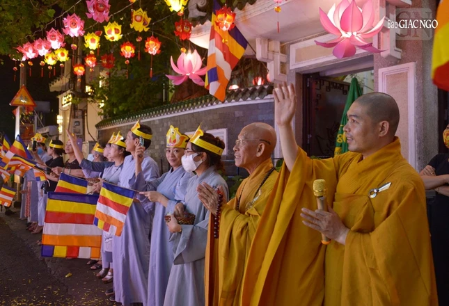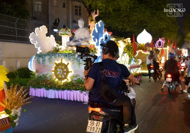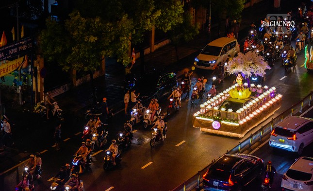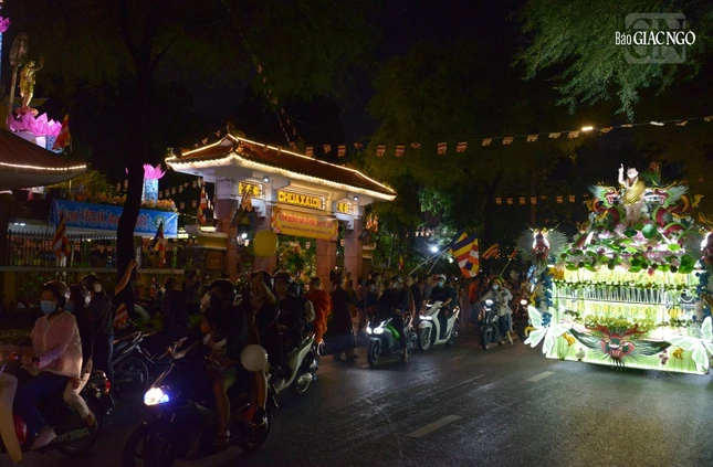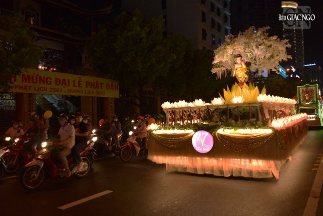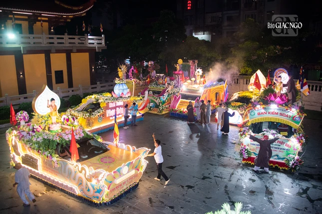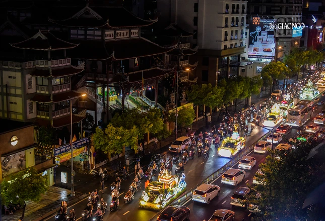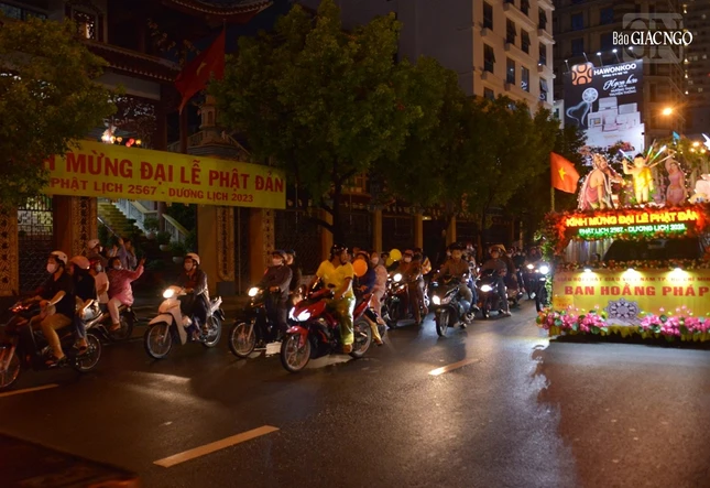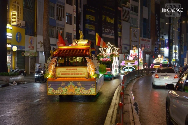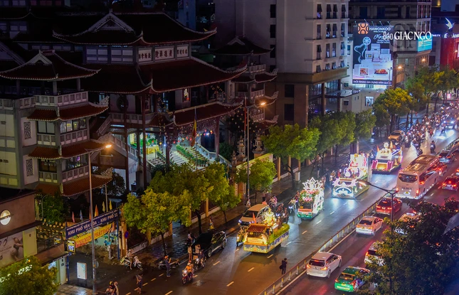 GNO - Đoàn xe hoa đầy sắc màu xuất phát từ lễ đài chính của Phật giáo TP.HCM - Việt Nam Quốc Tự diễu hành đi qua các tuyến phố trong tối 9-4-Quý Mão kính mừng Đức Thế Tôn đản sinh và tưởng niệm 60 năm ngày Bồ-tát Thích Quảng Đức vị pháp thiêu thân.