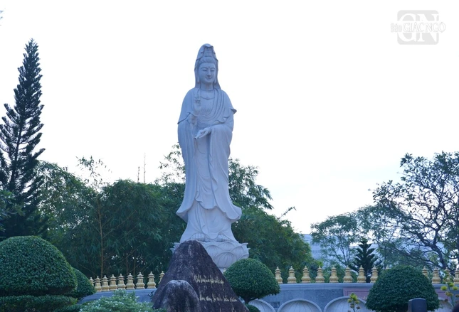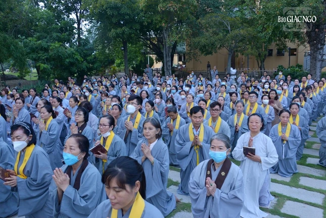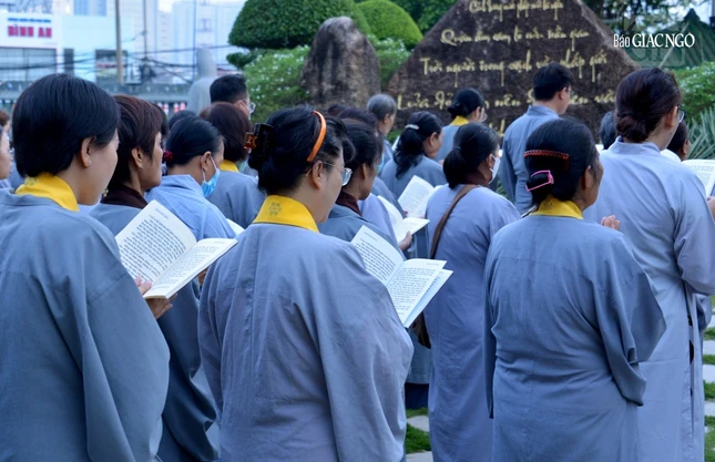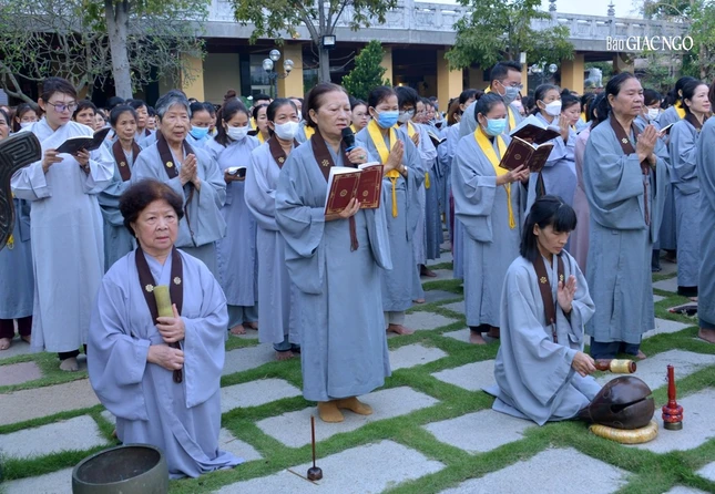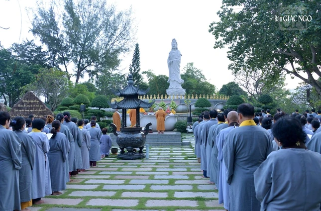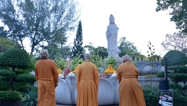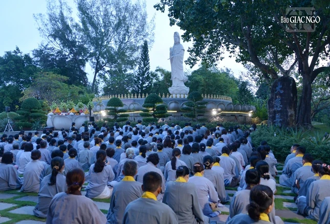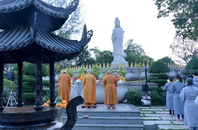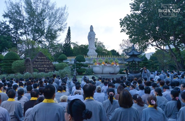 GNO - 6 giờ sáng 19-9-Quý Mão (2023), Phật tử đạo tràng Pháp Hoa đã đến chùa Huê Nghiêm - TP.Thủ Đức (TP.HCM) cùng tham dự lễ vía Đức Bồ-tát Quán Thế Âm, trì tụng phẩm Phổ Môn trong kinh Pháp hoa, trước thánh tượng lộ thiên trong khuôn viên chùa.