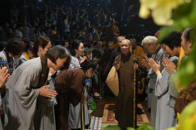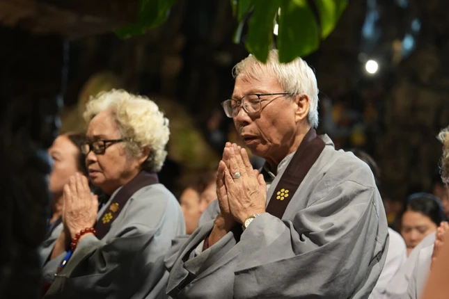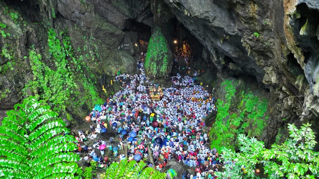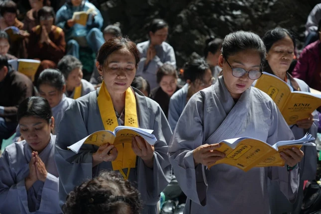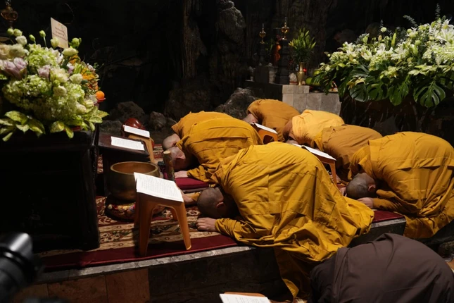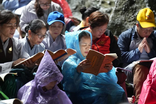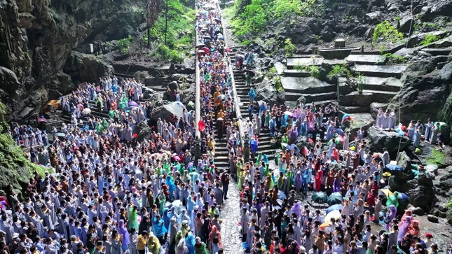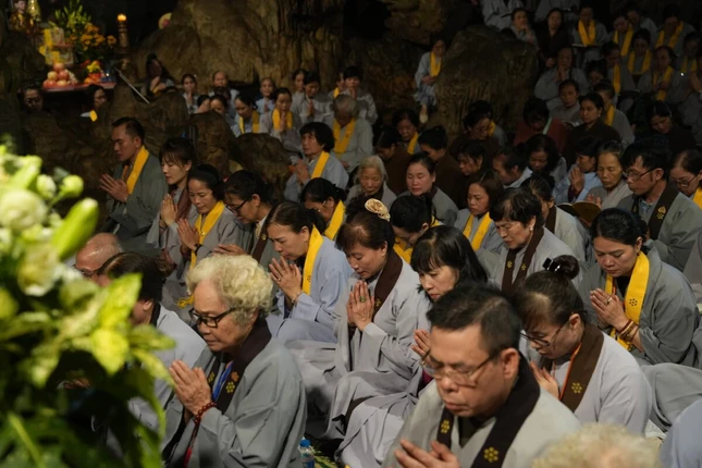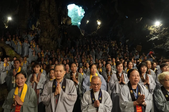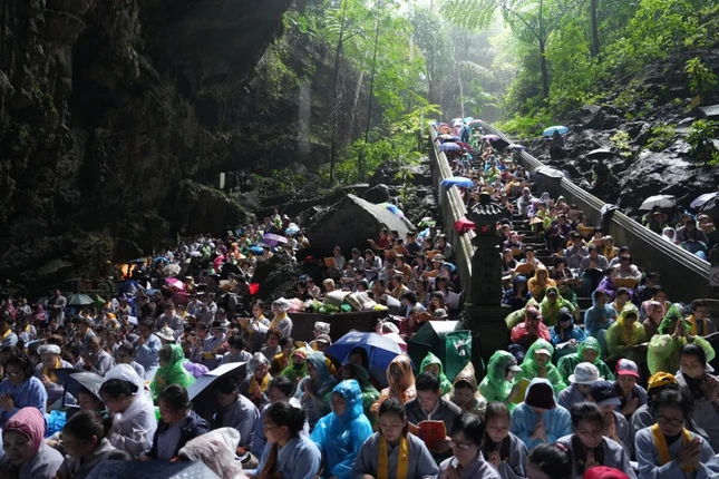 Theo chân Hòa thượng Thích Bảo Nghiêm trở về động Hương Tích, còn có hàng nghìn Phật tử đạo tràng Pháp Hoa từ khắp các tỉnh thành phía Bắc để cùng tham dự khóa lễ thiêng liêng này. Từng tiếng niệm hồng danh vang lên trầm hùng giữa mưa gió, ngân dài trong động thiêng, như kết nối từng nhịp thở với tâm nguyện quay về nương tựa nơi Bồ-tát Quán Thế Âm với niềm chí thành, chí kính.