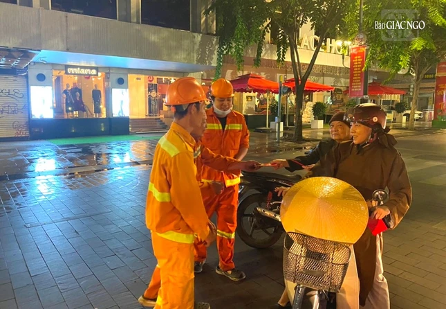 GNO - Rạng sáng 29 tháng Chạp (8-2-2024), Ni trưởng Thích nữ Tịnh Nguyện, Trưởng ban Thường trực Phân ban Ni giới T.Ư, trụ trì chùa Phước Hải (Q.10, TP.HCM) - năm nay 94 tuổi, được Sư cô Thích nữ Minh Từ chở Ni trưởng trên chiếc xe cúp 86 ra khu vực đường Nguyễn Huệ (Q.1) trao lộc Tết đến công nhân vệ sinh.