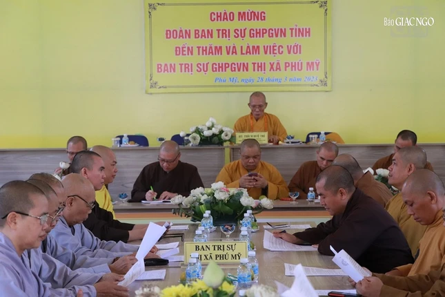 Tại phòng họp Vạn Phật Quang Đại Tòng Lâm tự, đoàn Ban Thường trực tỉnh gặp gỡ Ban Trị sự TX.Phú Mỹ. Hòa thượng Thích Huệ Trí nêu mục đích chuyến thăm và cách thức làm việc của đoàn với phương châm "Lắng nghe - thấu hiểu và cùng nhau giải quyết".