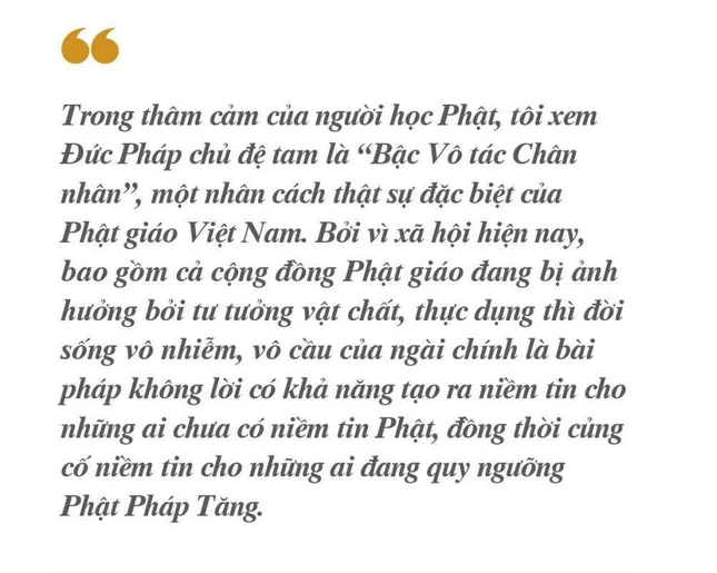 Nói khác đi, đó là sức mạnh nội tâm từ cuộc sống của những bậc chân tu, thể nhập thánh lưu, vượt ngoài mọi sự trói buộc của huyễn pháp. Trong thâm cảm của người học Phật, tôi xem Đức Pháp chủ đệ tam là “Bậc vô tác chân nhân”, một nhân cách thật sự đặc biệt của Phật giáo Việt Nam. Bởi vì xã hội hiện nay, bao gồm cả cộng đồng Phật giáo đang bị ảnh hưởng bởi tư tưởng vật chất, thực dụng thì đời sống vô nhiễm, vô cầu của ngài chính là bài pháp không lời có khả năng tạo ra niềm tin cho những ai chưa có niềm tin Phật, đồng thời củng cố niềm tin cho những ai đang quy ngưỡng Phật Pháp Tăng.