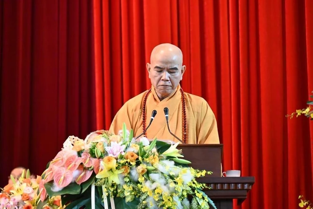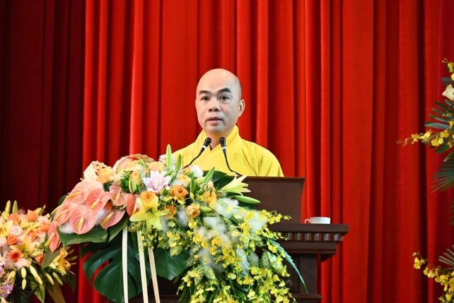 Thượng tọa Thích Phước Đạt, Phó Trưởng ban kiêm Chánh Thư ký Ban Giáo dục Phật giáo Trung ương đọc báo cáo tổng kết nhiệm kỳ VIII (2027-2022) và phương hướng hoạt động nhiệm kỳ IX (2022- 2027) của Ban.