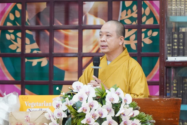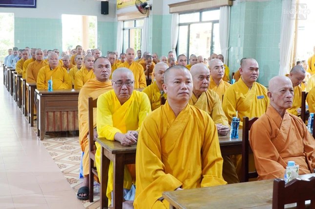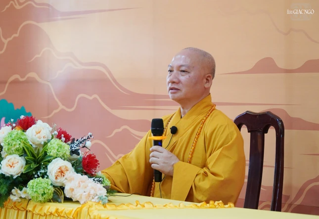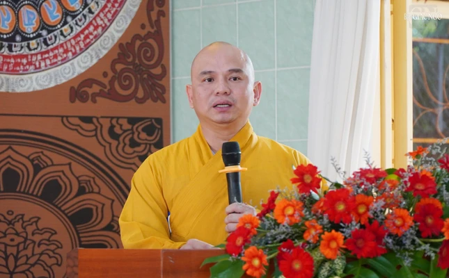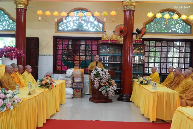 Thay lời chư tôn đức, Thượng tọa Thích Minh Sơn, Chánh Thư ký Ban Trị sự GHPGVN tỉnh Đồng Tháp phát biểu chào mừng và báo cáo sơ lược về tình hình an cư của tỉnh.