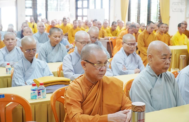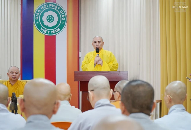Thay mặt Ban Trị sự tỉnh, Thượng tọa Thích Thiện Thông, Phó Thư ký kiêm Chánh Văn phòng Ban Trị sự báo cáo sơ nét công tác tổ chức khóa An cư kiết hạ Phật lịch 2568 của tỉnh Bà Rịa - Vũng Tàu. Theo đó, toàn tỉnh có 23 điểm an cư tại các huyện, thị xã, thành phố với tổng cộng 2.556 hành giả an cư.