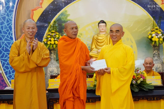 Hòa thượng Thích Hiển Chơn, Ni sư Thích nữ Huệ Tuyến, đồng Phó ban Kinh tế - Tài chính T.Ư trao cúng dường các trường hạ đến Thượng tọa Thích Viên Quang |
