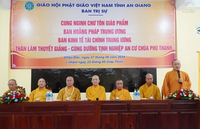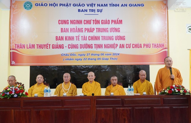 Thượng tọa Thích Viên Quang, Phó ban kiêm Chánh Thư ký Ban Trị sự GHPGVN tỉnh An Giang thay mặt Ban Thường trực Ban Trị sự GHPGVN tỉnh An Giang và 180 Tăng Ni an cư trên địa bàn tỉnh phát biểu bày tỏ niềm hân hoan được cung đón đoàn chư tôn đức về trường hạ thăm, trợ duyên đến Tăng Ni tỉnh an tâm tu học.