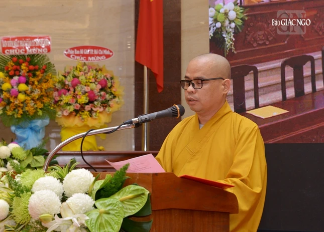 Đại đức Thích Trí Đức, Phó Thư ký Ban Trị sự thay mặt Ban Trị sự GHPGVN TP.HCM đọc quyết định chuẩn y điều chỉnh chức danh và bổ sung nhân sự của Ban Hoằng pháp GHPGVN TP.HCM khóa X (2022-2027) do Hòa thượng Thích Lệ Trang, Trưởng ban Trị sự GHPGVN TP.HCM ấn ký.